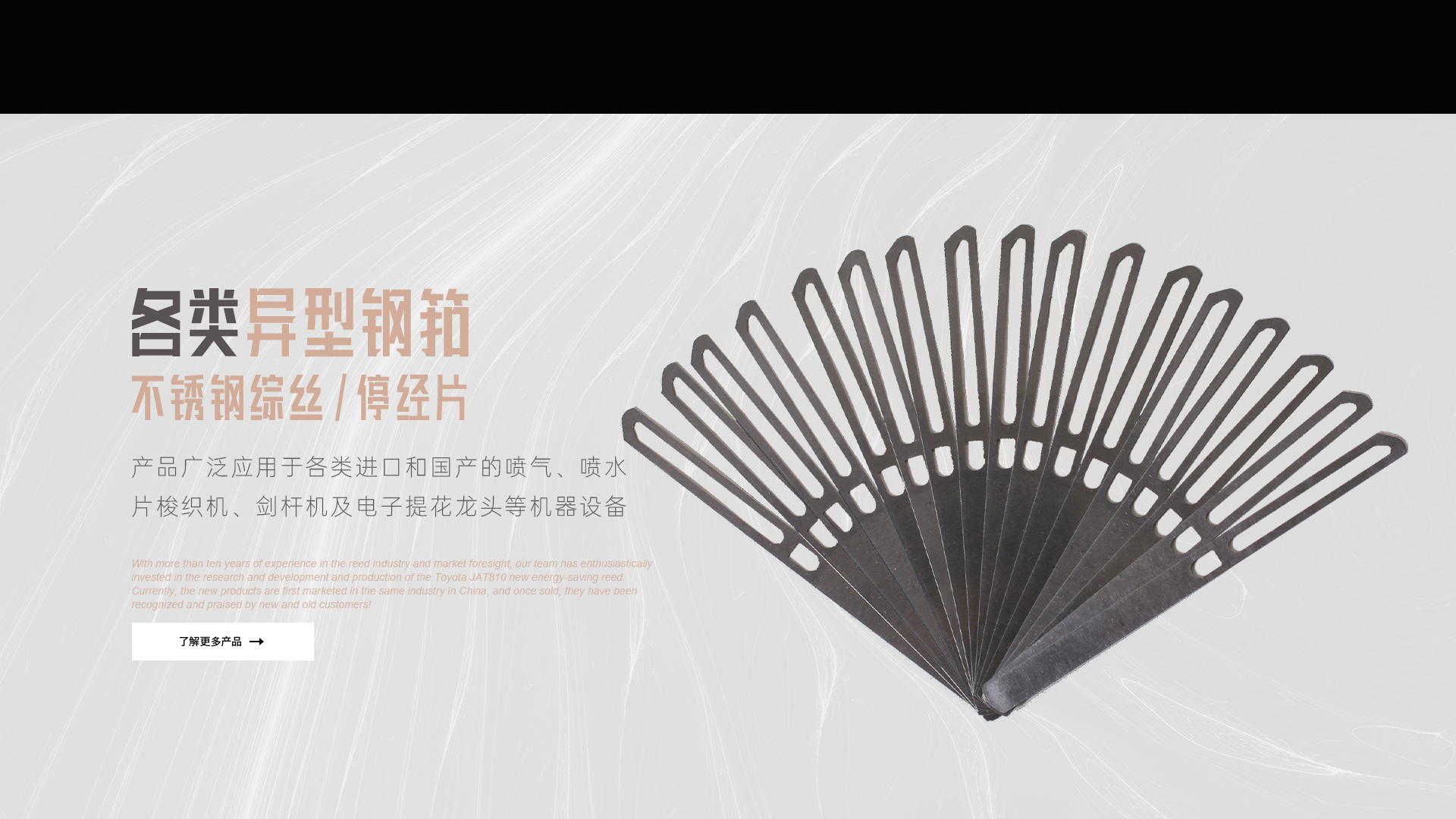 從事研發(fā)生產(chǎn)及銷售各類新型紡織器材的生產(chǎn)型企業(yè)。公司主要產(chǎn)品有:噴氣織機(jī)用各類異型鋼筘(傳統(tǒng)型豐田JAT710鋼筘及新研發(fā)的豐田JAT810節(jié)能筘);不銹鋼綜絲及不銹鋼停經(jīng)片。我們的產(chǎn)品廣泛應(yīng)用于各類進(jìn)口和國(guó)產(chǎn)的噴氣、噴水、片梭織機(jī)、劍桿機(jī)及電子提花龍頭等機(jī)器設(shè)備。
